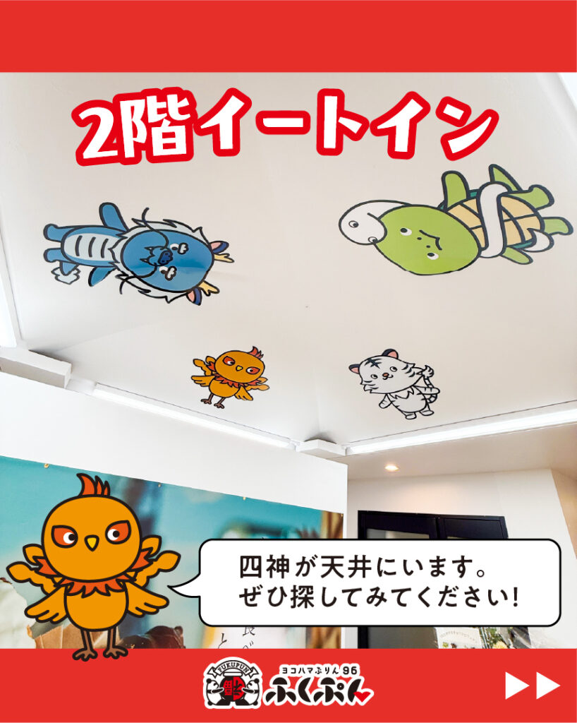 ふくぷんの2階イートインスペースの天井には、四神と四神キャラクターたちが描かれています。